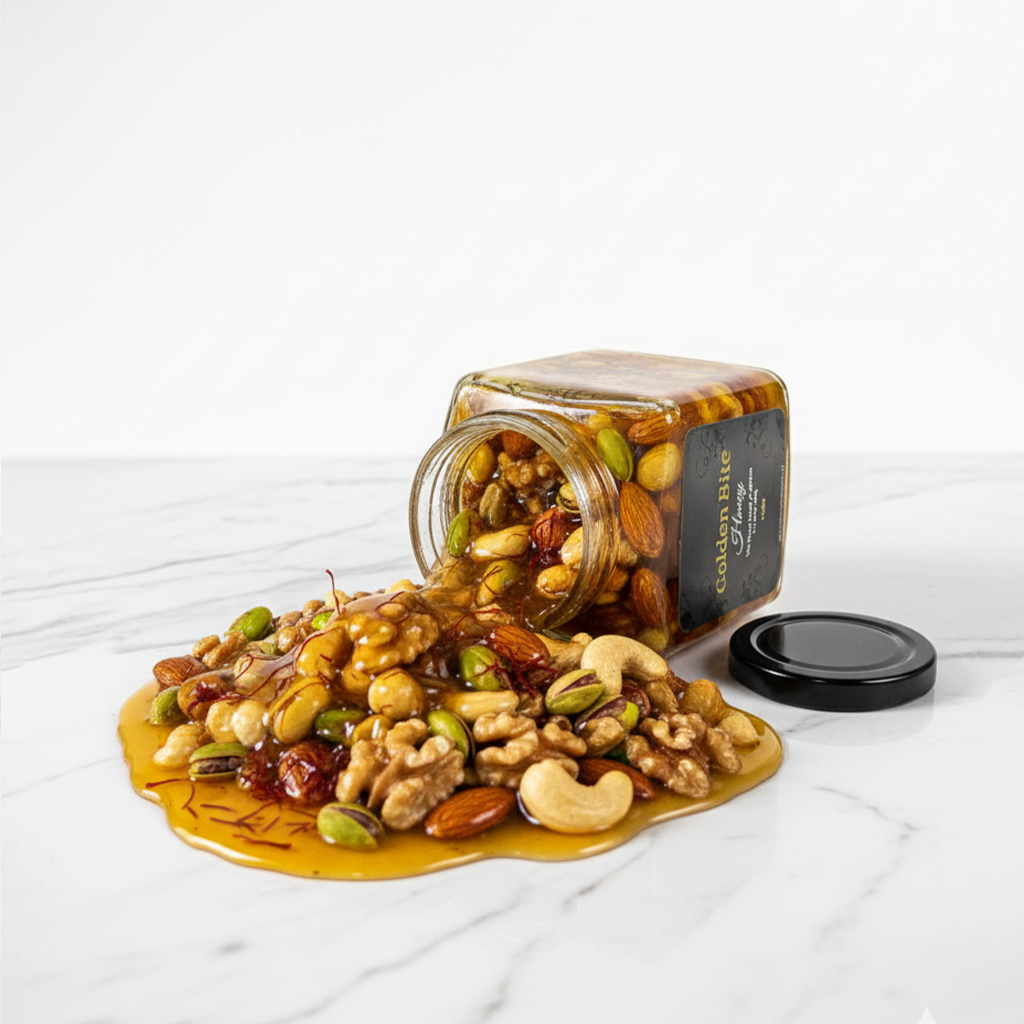 Golden Bite Honey is a luxurious blend of pure, natural honey infused with premium dry fruits, maghziat, and rich saffron. Every spoonful delivers a burst of flavor and nourishment, crafted to enhance your strength, vitality, and overall wellness. This special honey not only boosts immunity and energy but is also known for supporting a healthy and active married life.